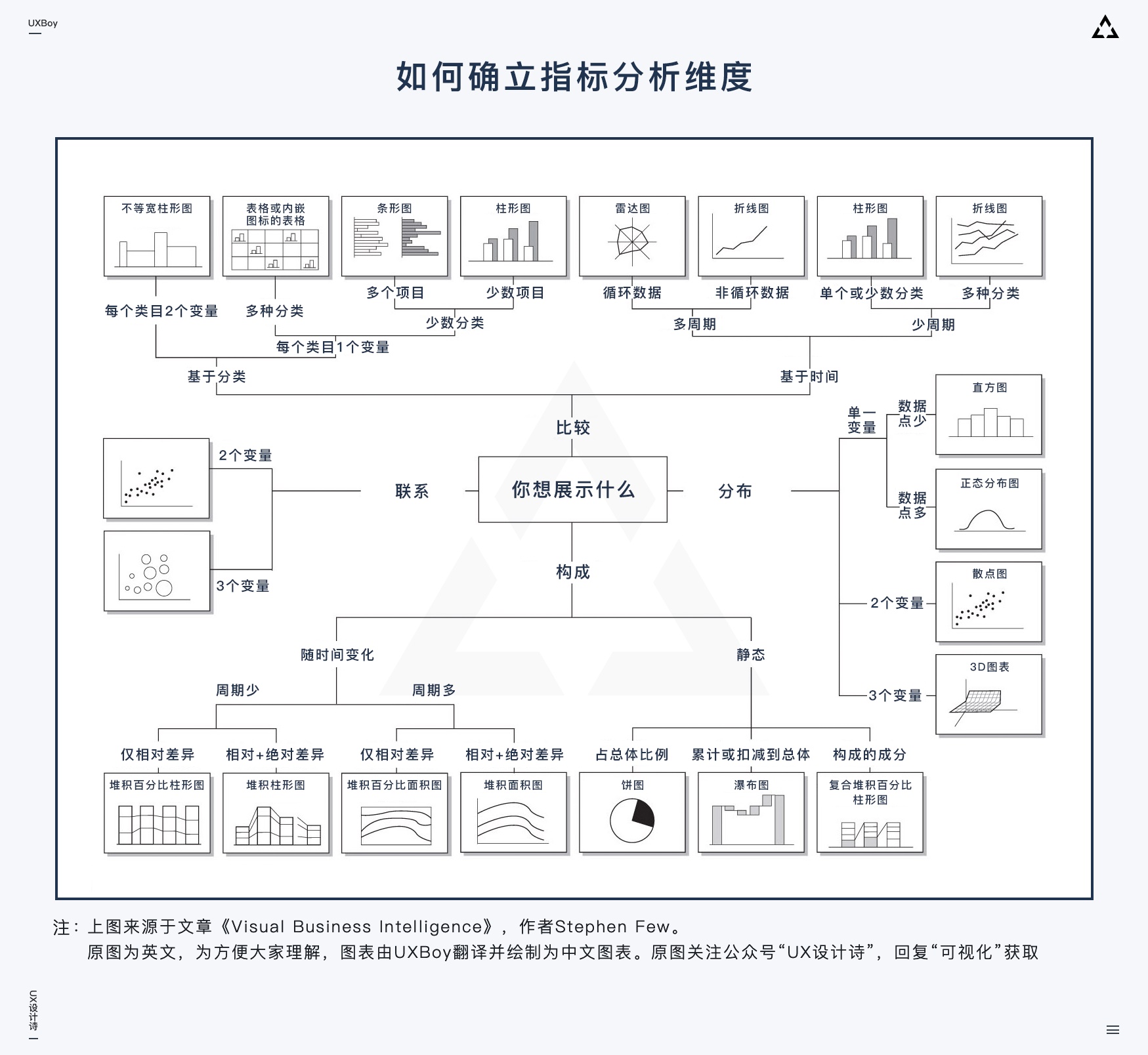 上圖向大家展示了數據分析常用的4個維度,我們在選定指標后,就需要跟項目組其他小伙伴討論:我們的各個指標主要想給大家展示什么,更進一步的講,是我們想通過可視化表達什么樣的規律和信息。而上圖,可以引導我們從「聯系、分布、比較、構成」四個維度更有邏輯的思考這個問題。