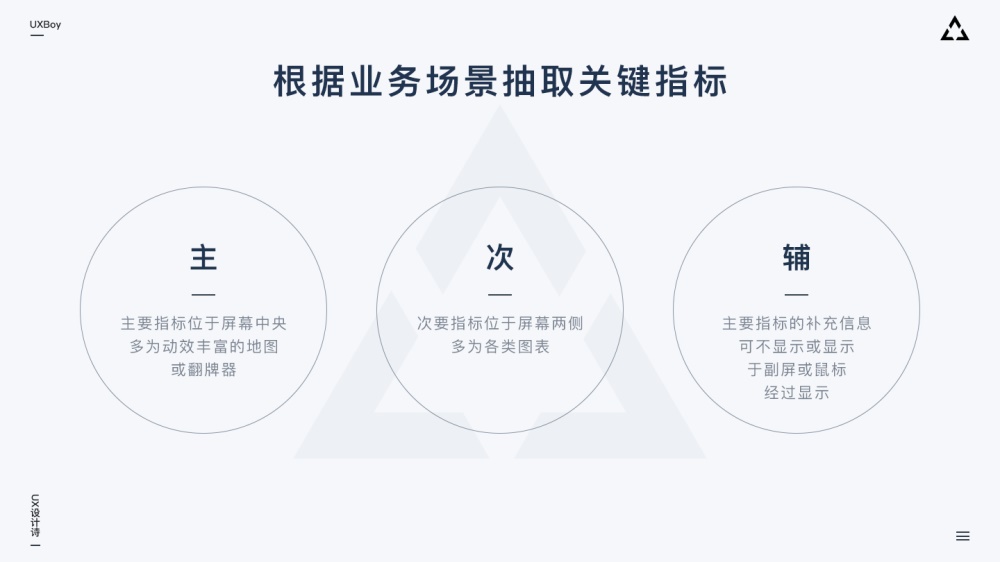 確定關鍵指標后,根據業務需求擬定各個指標展示的優先級(主、次、輔)。