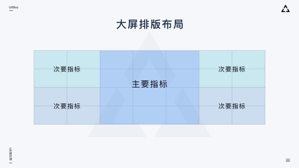 尺寸確立后,接下來要對設計稿進行布局和頁面的劃分。這里的劃分,主要根據我們之前定好的業務指標進行,核心業務指標安排在中間位置、占較大面積;其余的指標按優先級依次在核心指標周圍展開。一般把有關聯的指標讓其相鄰或靠近,把圖表類型相近的指標放一起,這樣能減少觀者認知上的負擔并提高信息傳遞的效率。
