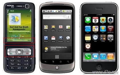 在底部的幾個按鍵的處理上(返回、菜單、home  、搜索),Android  的做法似乎介于傳統手機和iPhone  兩者之間,既保留了傳統手機的一些特性,但也在學習iPhone  的觸屏做法。  從蘋果遵循極簡的設計思路來看,  iPhone   做得更徹底、更加一 些。