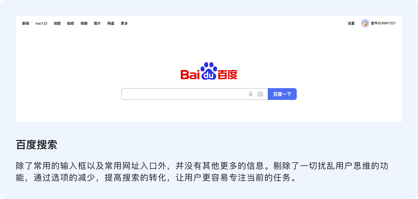 網(wǎng)頁通過大面積的留白營造平和感,通過高反差的對(duì)比創(chuàng)造視覺焦點(diǎn),將必要的信息烘托出來,然后借助留白包圍它們。通過這種方式把核心信息凸顯出來,當(dāng)用戶進(jìn)入該搜索頁時(shí),只做必要的事情,關(guān)注重要的信息。