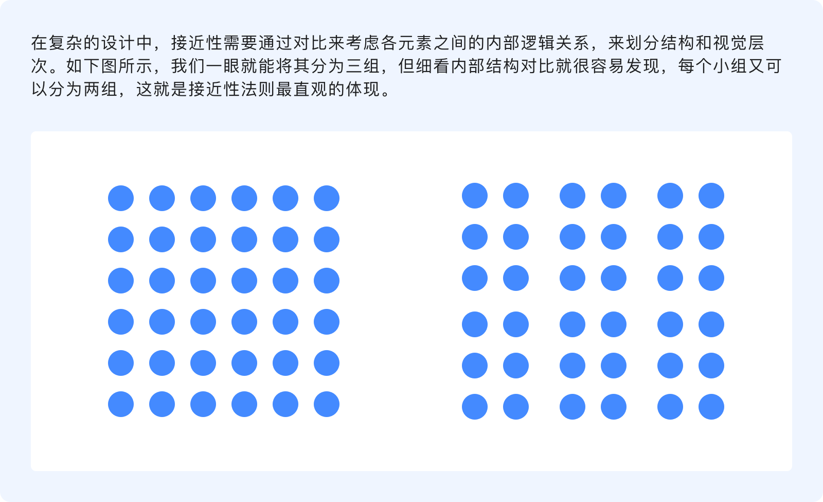 接近性原則指出,物體之間的相對距離會影響我們感知它們的關系,元素之間越是接近,組合在一起的可能性就越大,會被看作成一個整體,反之那些距離較遠的則自動劃分到組外。