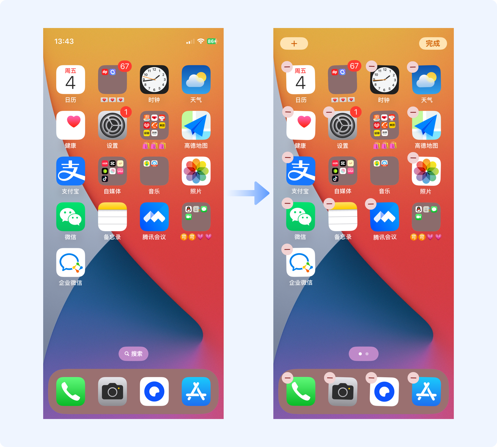 移動端產品中有很多這樣的案例,如iOS系統中,長按刪除某個APP時,所有桌面圖標會抖動、且左上角都有一個相同的刪除圖標,通過一致性的動作告知用戶圖標的可操作狀態,非常直觀。