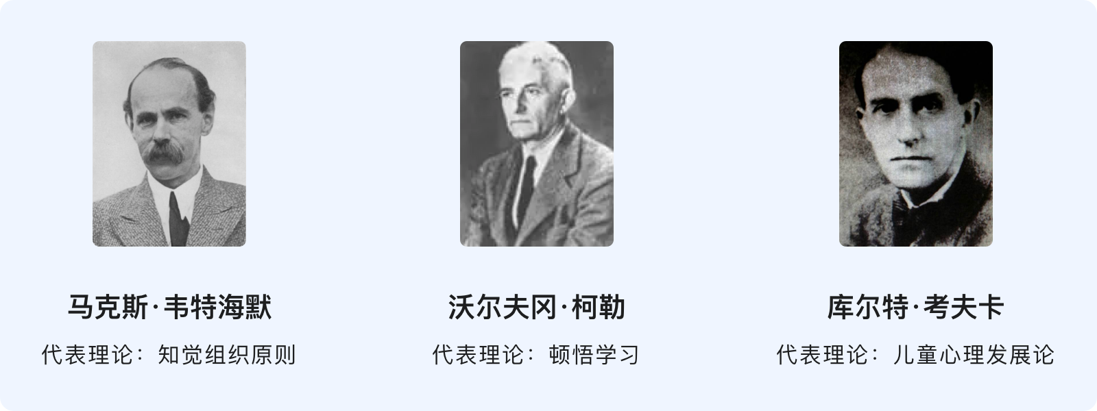 格式塔的德文為“Gestalt”,意思為「形狀」和「圖形」,在心理學中可以看作是任何一種被分離的整體。格式塔心理學的研究源于視知覺,是現代認知主義學習理論的先驅,為后來的社會心理學的發展打下了堅實的基礎,其創始人是韋特海墨、考夫卡和苛勒。