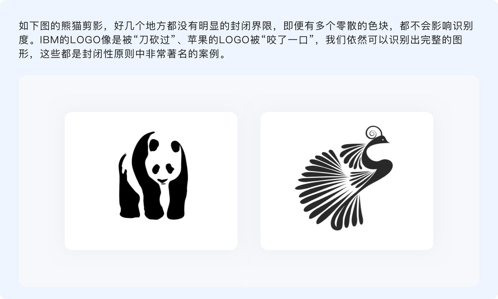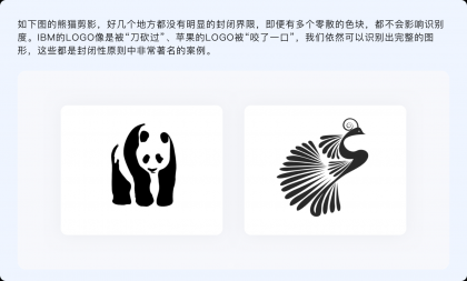 封閉性原則指出,人們的視覺系統傾向于將不完整的局部當做一個整體來感知。看起來與連續性有諸多相似,不過連續性是通過物體的形狀和運動方向、按照視覺慣性來制定閉合規律,而封閉性則并無特定規律,只要把握好不完整物體的尺度、使各元素之間相互輔助,就能讓其與我們認知模型中的原型匹配。