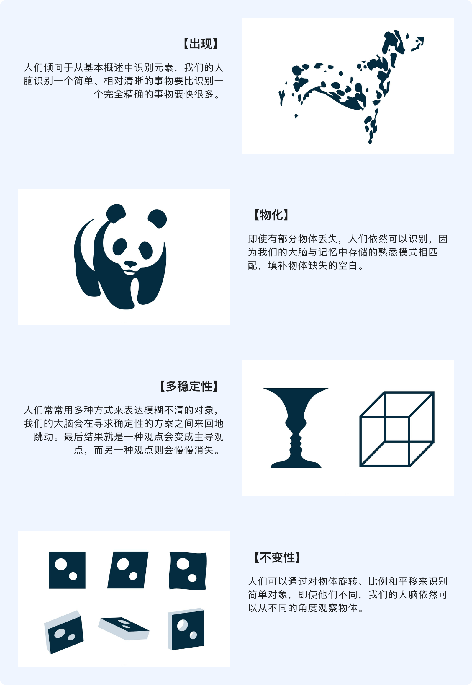 格式塔原理試圖解釋人們在合適的情況下如何看待視覺元素。這些建立在四個關鍵想法上:【出現】、【物化】、【多穩定性】、【不變性】。