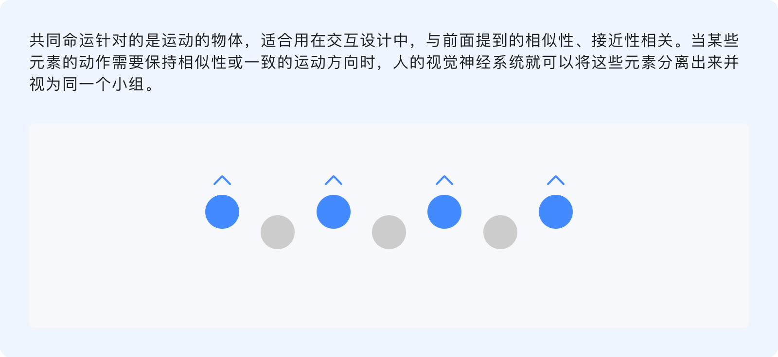 共同命運原則指出,人們傾向于將具有共同運動形式的事物感知為一個彼此相關的整體,無論元素之間的距離有多遠、或其他屬性(形狀、顏色、大小)各異,但只要沿著相同的方向、相同的速度運動,共同命運就會將其歸類。