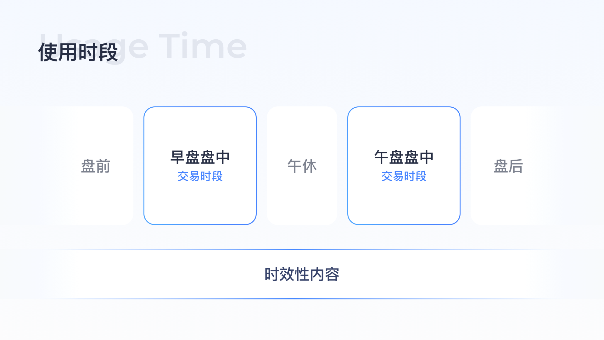 股票交易時段有固定的交易周期,包括盤前/早盤盤中/午休/午盤盤中/盤后幾個固定時段,不同時段用戶需求不同,了解不同時段的用戶需求可以更好的滿足用戶,比如開盤過程中用戶想看到更實時更專業的行情信息、實時的資訊動態,而在盤前/盤后用戶更想看到的是今日大盤的走勢預測/收盤后的大盤總結,除了固定周期的用戶需求,突發的新聞資訊類時效性內容對用戶做決策分析也很重要。