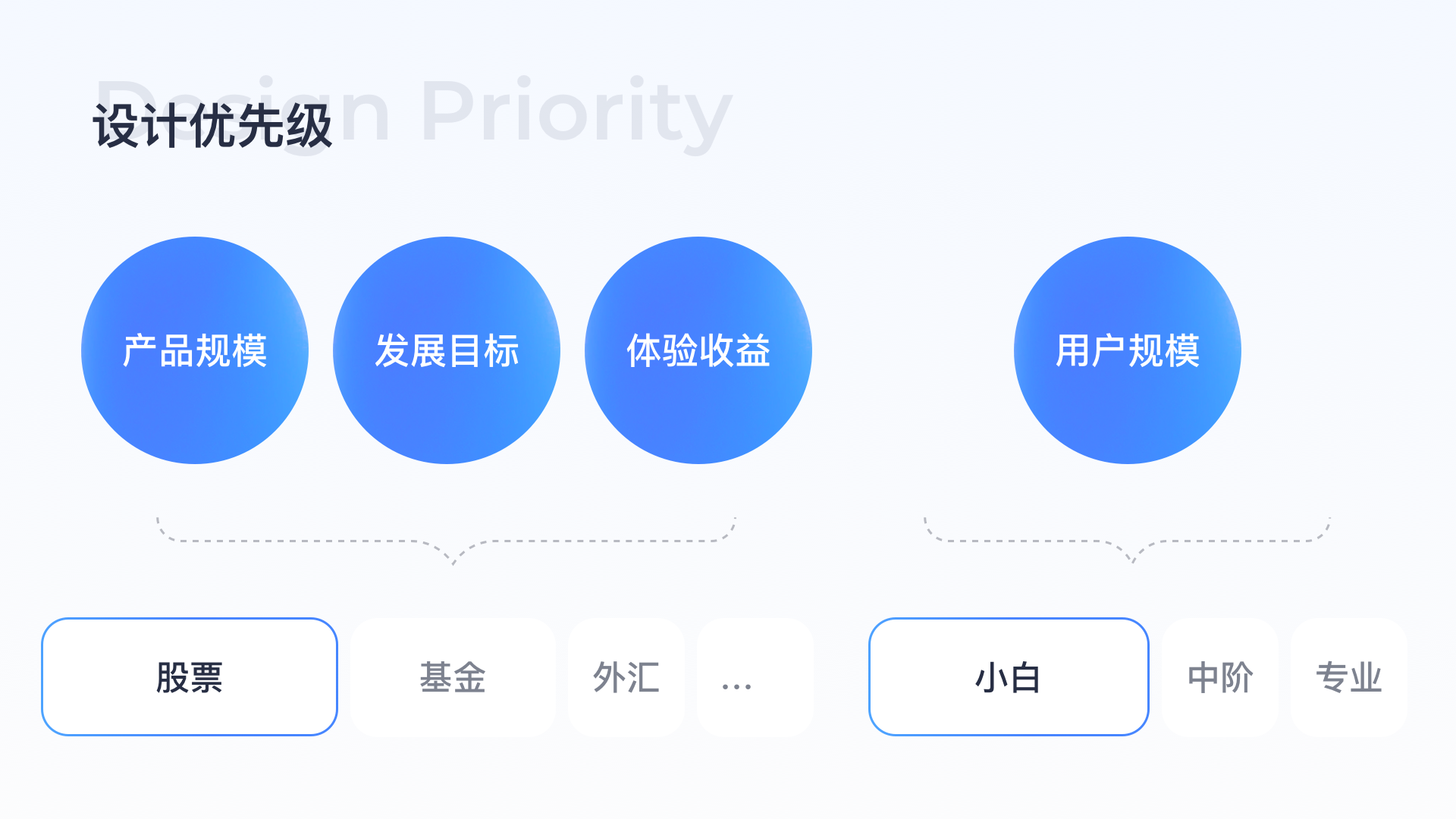 由于開發資源有限,不能一次做完所有產品設計優化,因此需針對優化內容排布優先級,對高優場景進行優化,這里的方法是結合用戶分類規模、產品品類規模、發展目標、體驗收益高低明確優化優先級,通過上述精細化分析得出結論股票場景用戶規模大,且小白用戶占比高,因此在股票場景下針對偏小白用戶高優進行設計優化。
