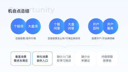 分析需求:典型搜索詞股票開戶等轉化詞,線上僅有開戶入口列表,但實際搜索用戶有潛在的查找開戶方式需求未滿足,因此需先滿足用戶了解開戶流程的需求,再提供轉化入口。