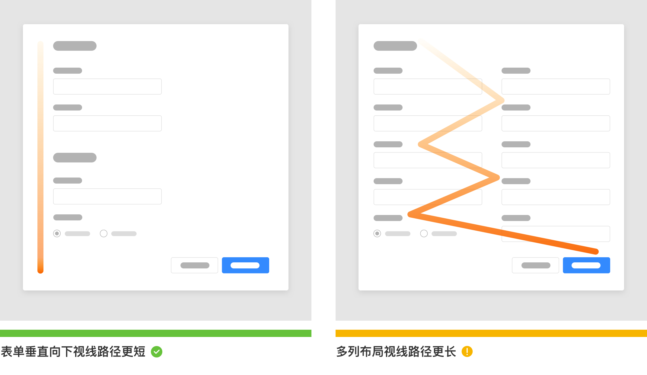 如果表單使用單列,則完成的路徑是頁面垂直向下的一條直線,單列布局能夠給用戶呈現一條清晰的視覺路。因此,表單較為簡單時盡量避免將表單分成多列,在業務場景允許的情況盡量使用單列(部分業務訴求和一些特定場景要求,多列布局會更節省垂直空間,但是多列布局需要考慮字段之間的關聯性,這里不強求一定只能使用單列布局)。