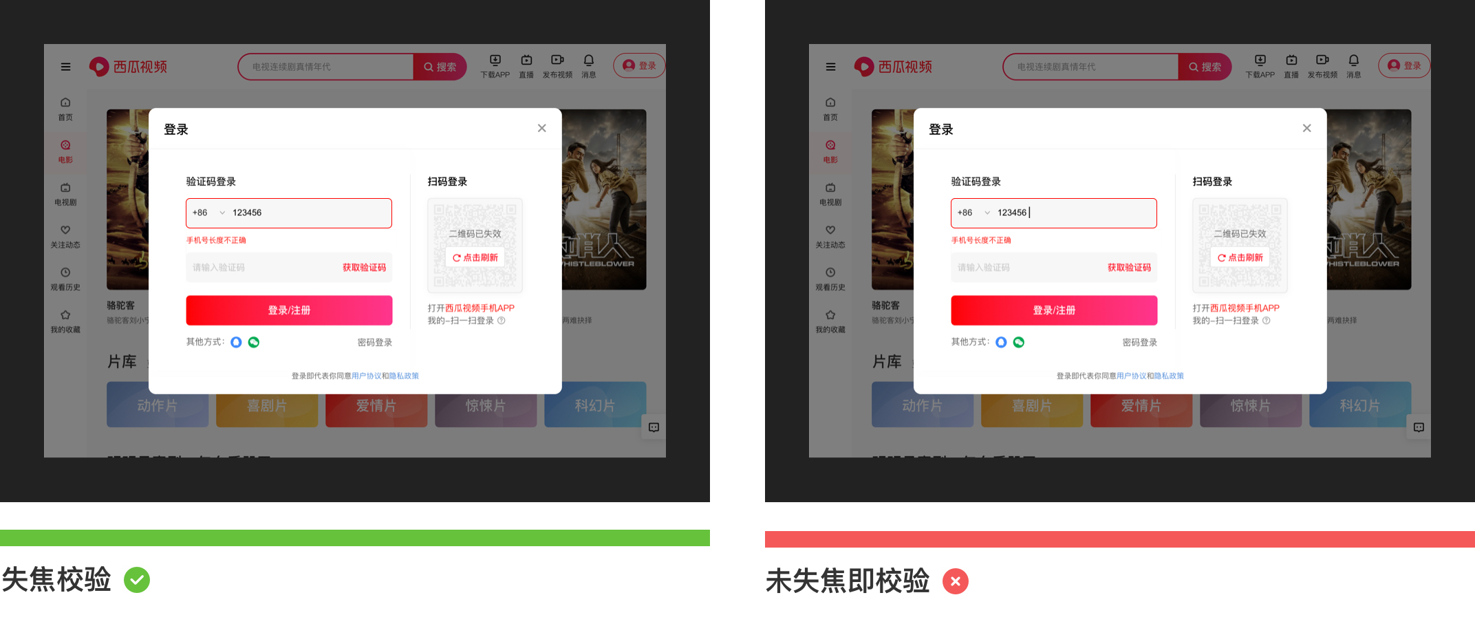 為了避免用戶在提交時表單時出現大面積的報錯問題,設計師可以使用實時校驗的交互形式。如:在用戶輸入完成之后鼠標失焦后進行信息校驗,但是需要注意的是在實時校驗時避免用戶還沒有輸入完成即出現校驗誤導用戶,所以需要準確判斷鼠標是否失焦。如下圖所示為西瓜視頻登錄注冊場景下的截圖: