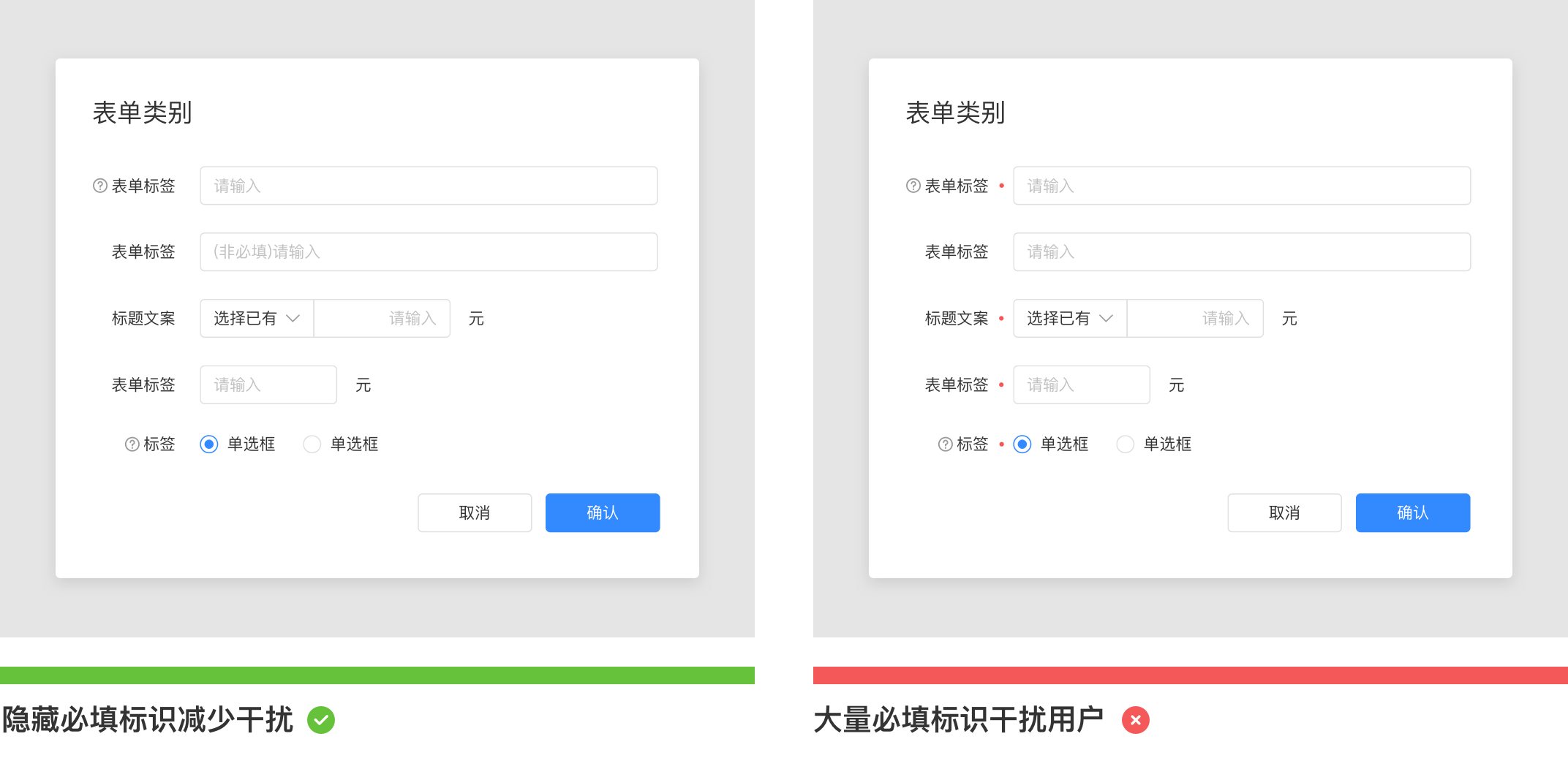 還有一點是表單中視覺噪聲越少可讀性越強,因此當必填項多于非必填用非必填字段提示用戶會更好。