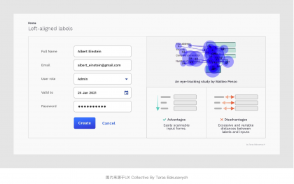 將表單標簽放置在其對應的輸入字段的左邊,標簽左對齊。表單標簽和輸入字段距離較遠,用戶從左至右瀏覽時間變長,并且根據上面Matteo Penzo的時間表上看,左對齊的瀏覽和填寫的效率是3種常規的對齊方式中最慢的一種。但是,如果業務需要用戶對表單放慢速度并謹慎填寫(復雜表單或者表單中含有大量高級設置的陌生數據時),左對齊的方式會減少部分用戶的出錯率。但不太適合非中國區業務。