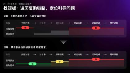 當我們以用戶視角,遍歷咨詢鏈路中的復購引導時,發現復購引導的觸點覆蓋不足,且缺少對特定場景下需求的識別,例如在咨詢開始時復購需求極弱,但設計引導極強;而在隨后的對話過程中需求漸增,但引導缺失。因此,我們制定了行業首創的漸進式引導策略;隨著服務推進,復購需求漸增,觸達強度也逐級遞進。