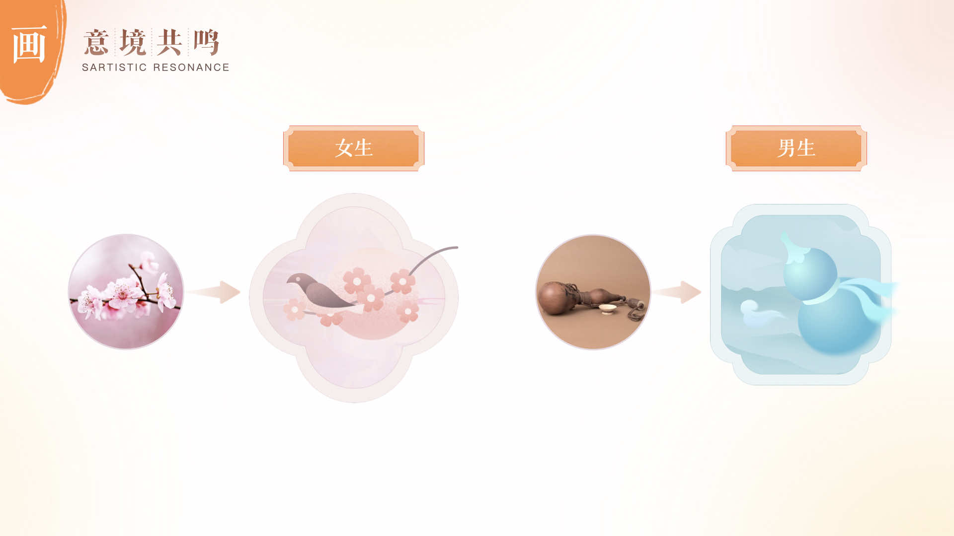 例如,女生的插畫圖形,首先劃分為偏向言情類型,由此聯想到一只小鳥站在桃花上,整體采用粉色調的場景進行展現,夢幻而唯美。男生的插畫圖形則偏向玄幻類型,從而聯想到葫蘆,由此繪制出葫蘆和浮云結合的畫面,自由而飄逸。