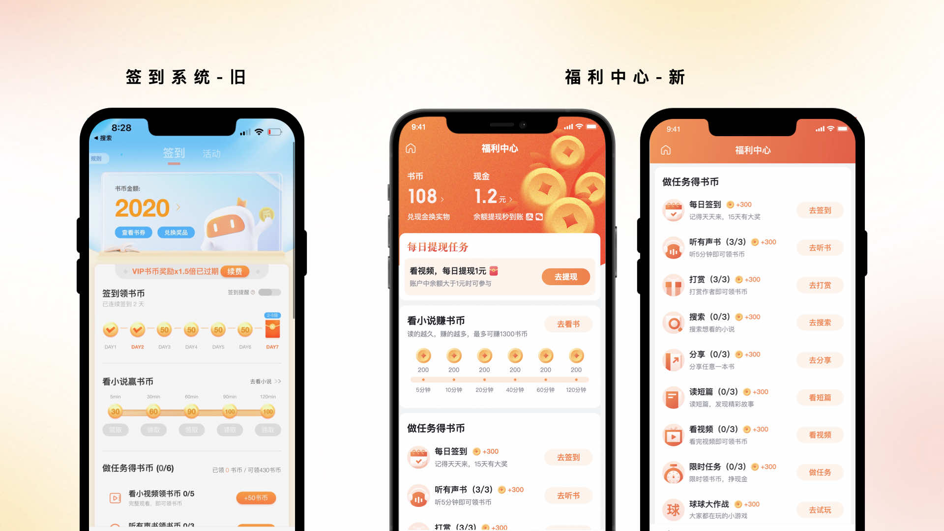 以人為本的設計能夠讓用戶在產品中獲得成就和滿足感,從而形成愉悅的產品體驗。為了讓用戶能夠獲得滿足的感受,我們將舊版的簽到系統升級為金幣激勵體系,采用做任務賺金幣的形式,增加用戶的成就感。