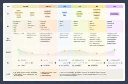 用戶旅程圖是一種圖形化工具,用于詳細描述用戶在使用產品或服務時所經歷的各個階段和步驟。它能夠展示用戶的整個使用過程,包括用戶的需求、痛點、態度和行為,以及產品或服務如何與用戶進行互動。作為產品設計者,我們可以通過用戶旅程圖更好地理解用戶需求,提前發現后續的用戶體驗問題,并思考如何提升產品或服務的用戶體驗。