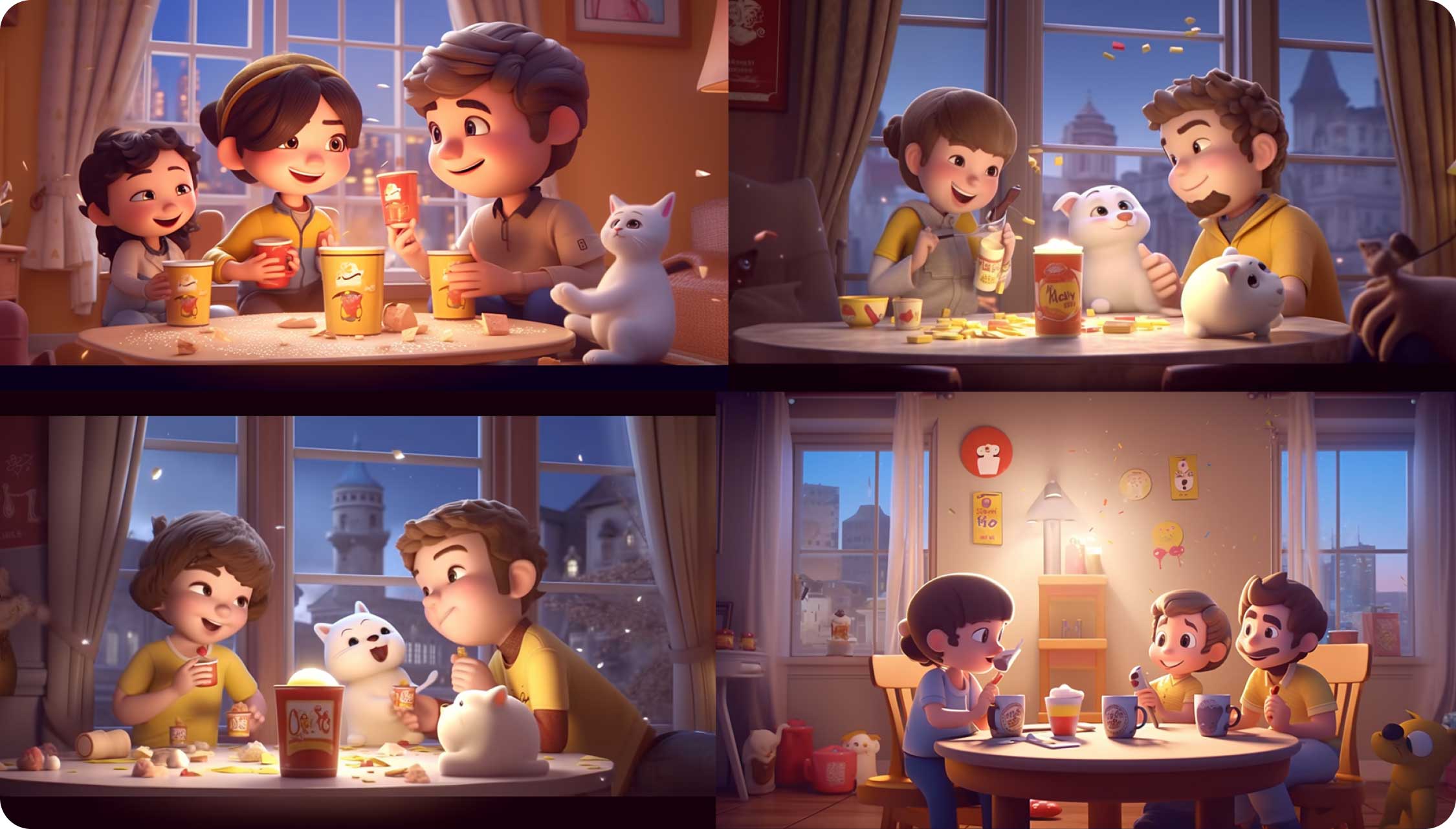在前期,我們對構想的畫面進行關鍵詞的描述:“可愛帥氣的男女孩子們一起玩手機,開心地微笑著,舉起手歡呼,溫暖的房間,大型落地窗。”將關鍵詞翻譯后放入Midjourney中進行煉圖,最終篩選了幾張氛圍還不錯的進行下一步操作。