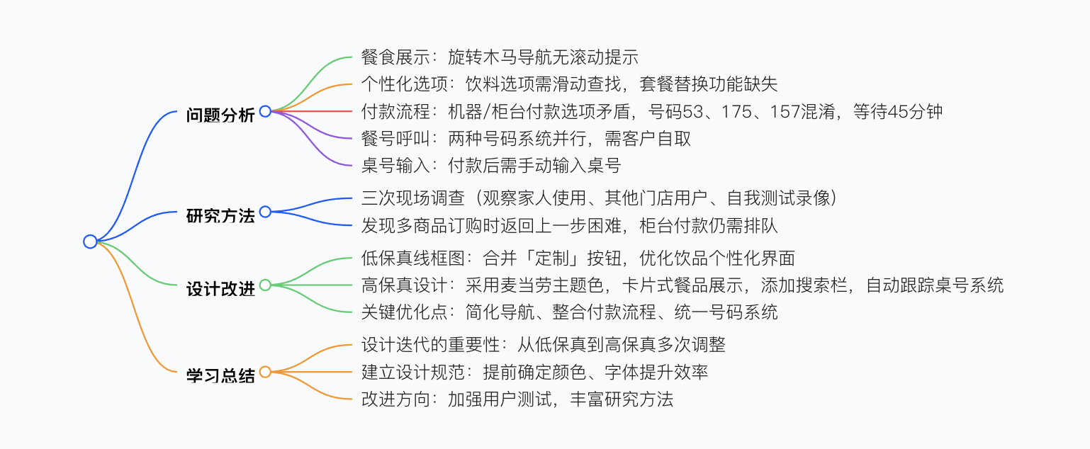 本文圍繞麥當(dāng)勞自動點(diǎn)餐系統(tǒng)的用戶體驗(yàn)展開分析,指出其在餐食展示(無滾動提示)、個性化選項(xiàng)(需手動滑動才能看到更多)、付款流程(存在 53、175、157 三個混淆號碼,導(dǎo)致 45 分鐘等待)、餐號呼叫系統(tǒng)(兩種號碼并行)、桌號輸入等環(huán)節(jié)存在問題。作者通過三次現(xiàn)場調(diào)查,基于用戶畫像和故事板構(gòu)建解決方案,經(jīng)低保真與高保真原型迭代,重新設(shè)計(jì)了菜單展示、個性化選項(xiàng)流程及付款系統(tǒng),最終強(qiáng)調(diào)設(shè)計(jì)中反復(fù)測試和建立規(guī)范的重要性。
