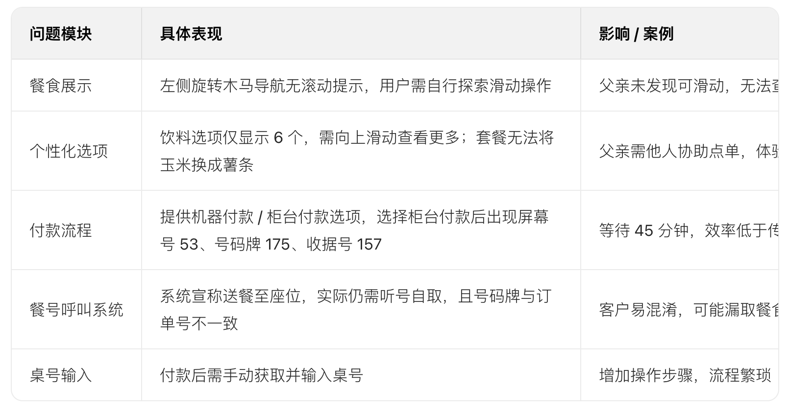 發(fā)現(xiàn)痛點(diǎn):多商品訂購時返回上一步困難,柜臺付款仍需排隊(duì)等待收銀員。