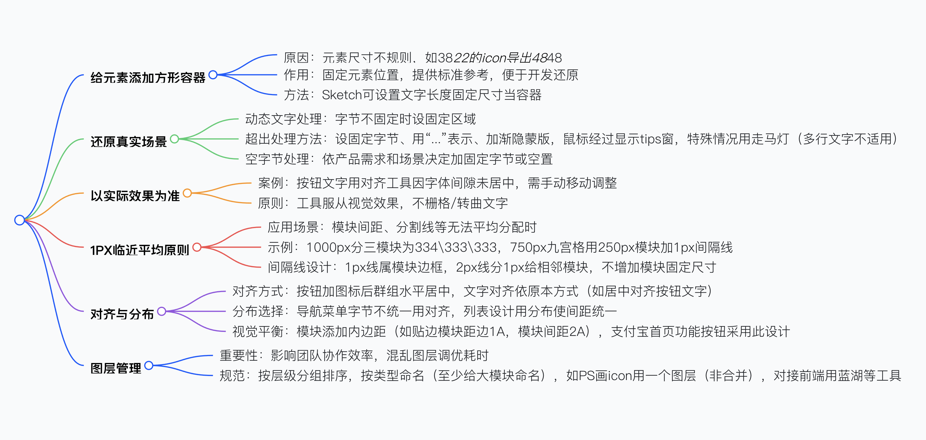 UI 設計需死摳細節,包括給元素添加方形容器以固定位置方便開發還原,盡可能還原真實場景如處理動態文字字節用省略號、漸隱蒙版或 tips 窗,以實際效果為準調整文字對齊(如手動移動解決字體間隙問題),遵循 1PX 臨近平均原則處理無法均分的尺寸(如 334\333\333 的分配),注意對齊與分布(如導航菜單按需求選擇對齊或分布方式并添加內邊距實現視覺平衡),以及做好圖層管理(按層級分組命名以提高協作效率),這些細節體現設計師專業素養并提升設計質量。