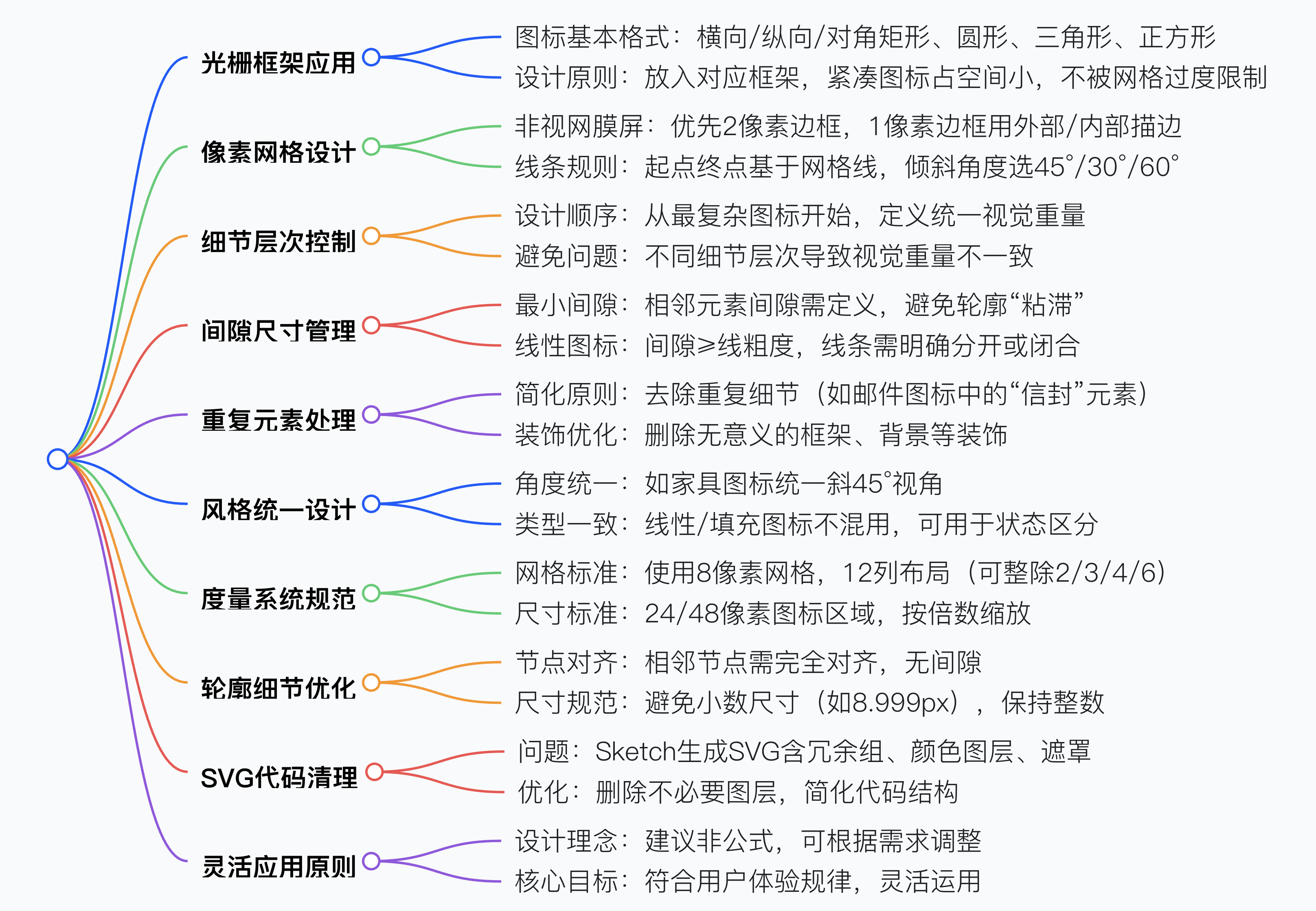 UI 界面圖標設計的 10 個關鍵細節:使用光柵框架確保圖標視覺重量一致,設計時注意像素網格重要性、優先 2 像素邊框,從最復雜圖標開始設計以保持細節層次統一,控制相鄰元素最小間隙、避免輪廓 “粘滯”,去除重復圖形元素以簡化設計,保持圖標風格(如角度、線性 / 填充)一致,基于 8 像素網格等二倍數度量系統設計,確保輪廓節點對齊、尺寸為整數,清理 SVG 代碼中的冗余圖層,同時強調這些建議需靈活應用而非刻板遵循。