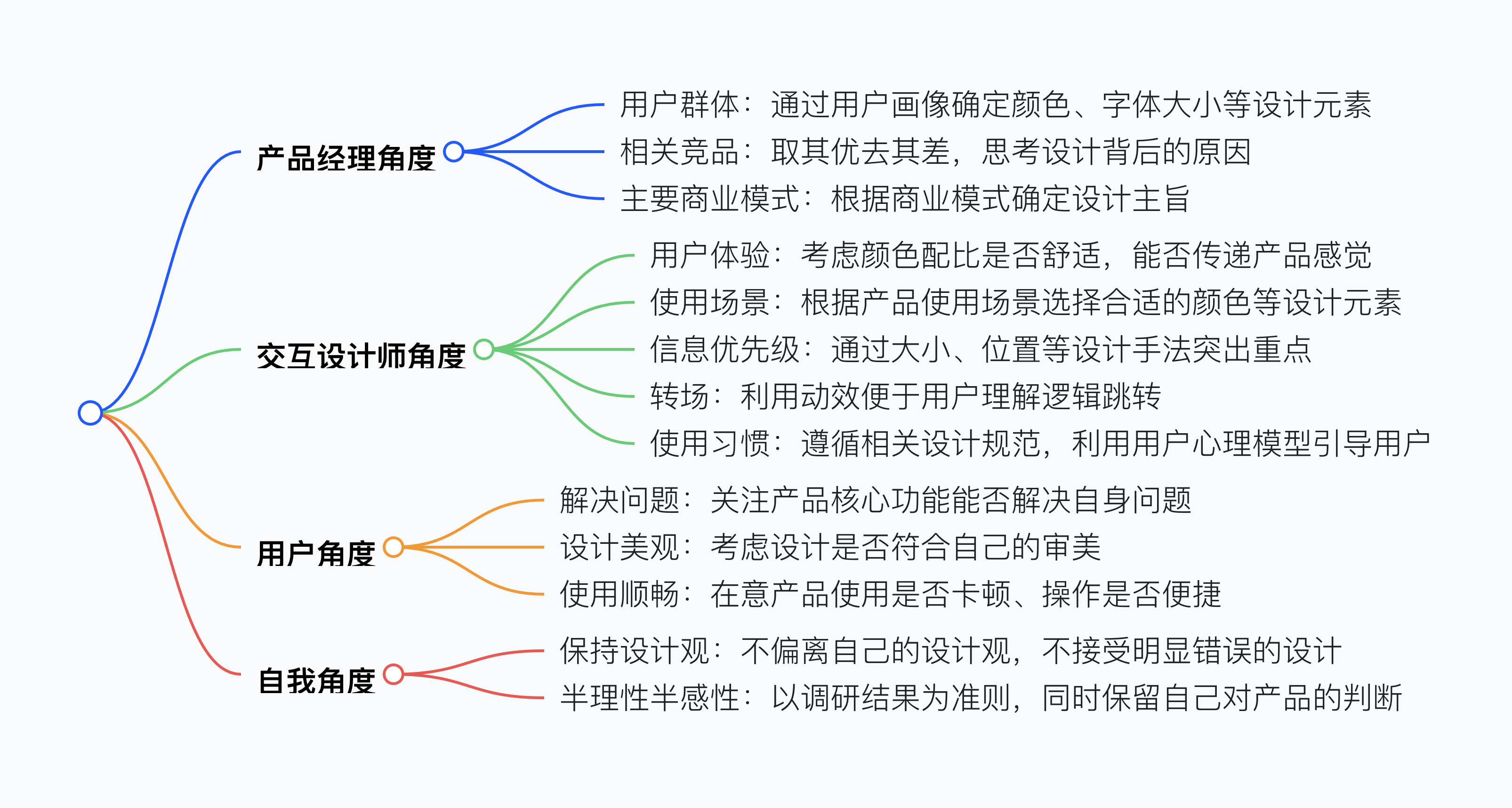 UI 設計需從產品經理、交互設計師、用戶和自我這 4 個角度思考:像產品經理一樣關注用戶群體、相關競品、主要商業(yè)模式;像交互設計師一樣考慮用戶體驗、使用場景、信息優(yōu)先級、轉場、使用習慣;像用戶一樣思考產品能否解決問題、設計是否美觀、使用是否順暢;像自己一樣保持設計觀,不盲目接受錯誤設計。如此才能做出符合用戶需求且有自己韻味的設計。