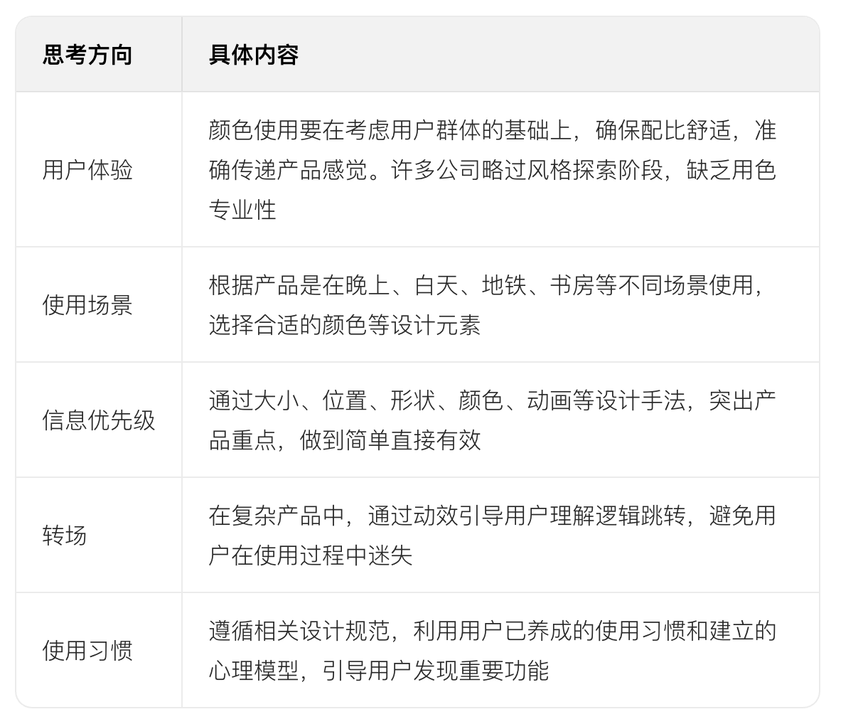 • 答案:交互設計師角度的思考包括用戶體驗、使用場景、信息優(yōu)先級、轉場、使用習慣等方面。在用戶體驗上,影響顏色配比的舒適性和對產品感覺的傳遞;在使用場景上,決定設計元素是否符合產品使用環(huán)境;在信息優(yōu)先級上,指導如何通過設計手法突出重點;在轉場上,幫助用戶理解邏輯跳轉;在使用習慣上,利用用戶心理模型引導操作,這些都能提升 UI 設計的實用性和用戶體驗。