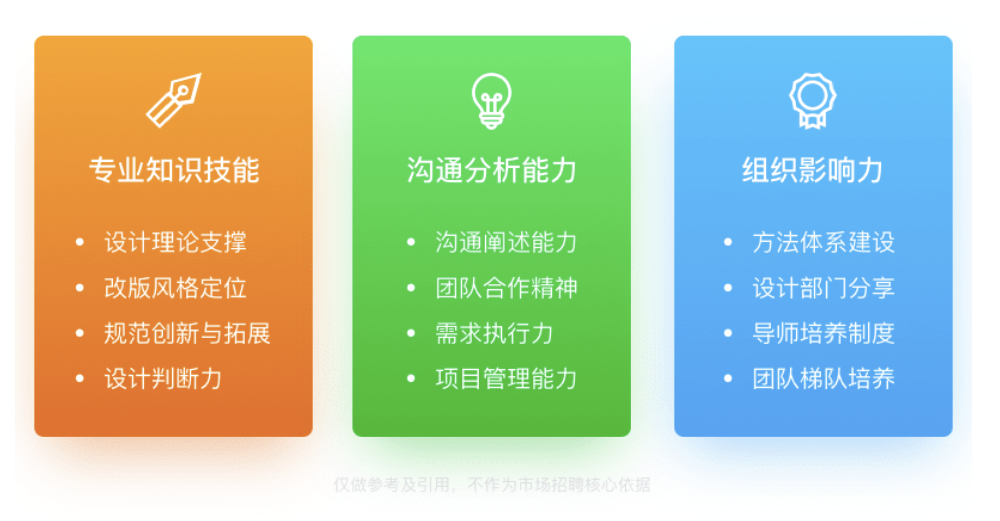 • 溝通分析能力愈發(fā)受重視,例如設(shè)計(jì)師需能解釋設(shè)計(jì)方案的出發(fā)點(diǎn)、布局原因、驗(yàn)證依據(jù)及理論支撐等。以阿里 P6、美團(tuán) P2-3、小米 D2-3 等職級(jí)要求為例,溝通分析能力的重要性甚至超過(guò)專業(yè)設(shè)計(jì)能力。