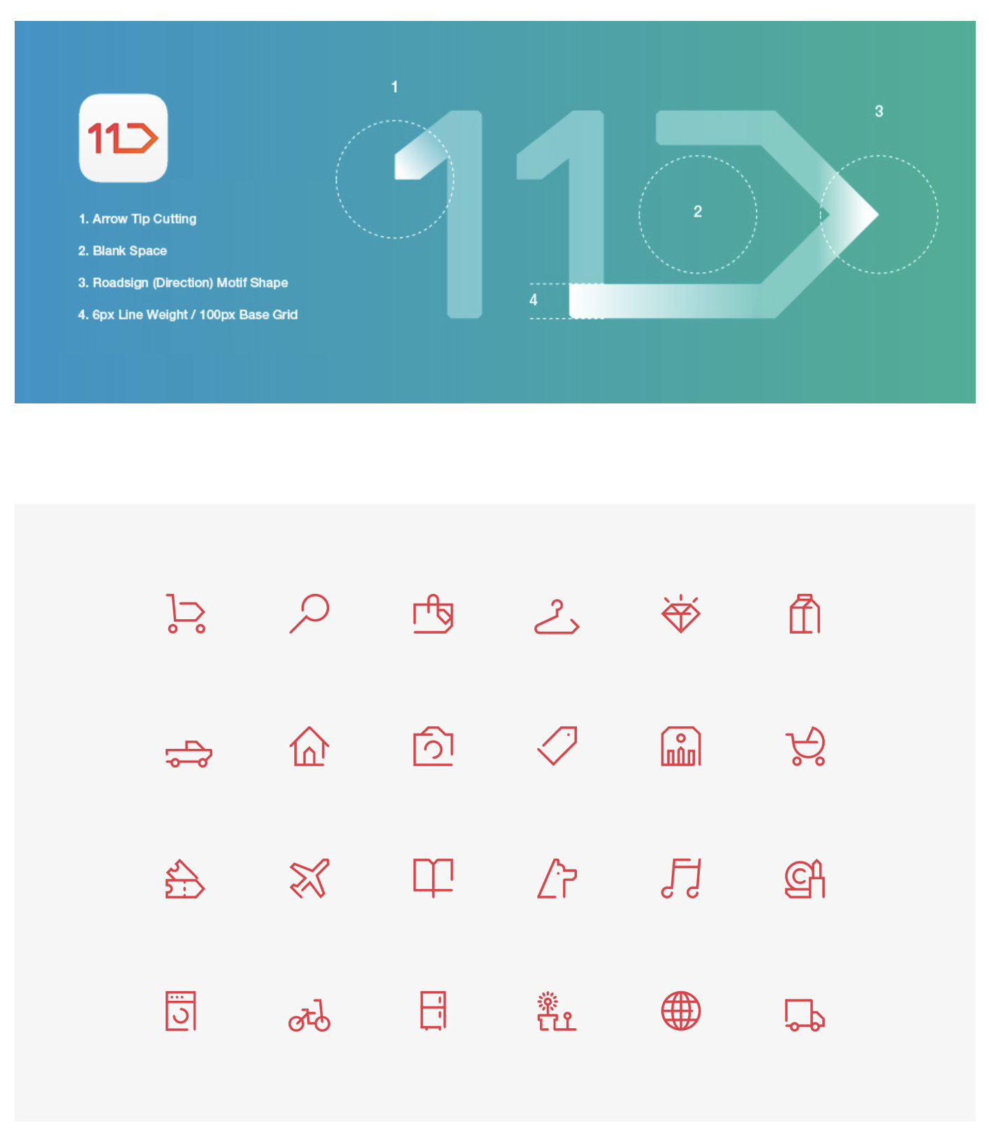 • 案例 1:韓國電商 “11 街” 的功能圖標延續了 logo 的圖形特點,區別于競品,增強用戶認知。