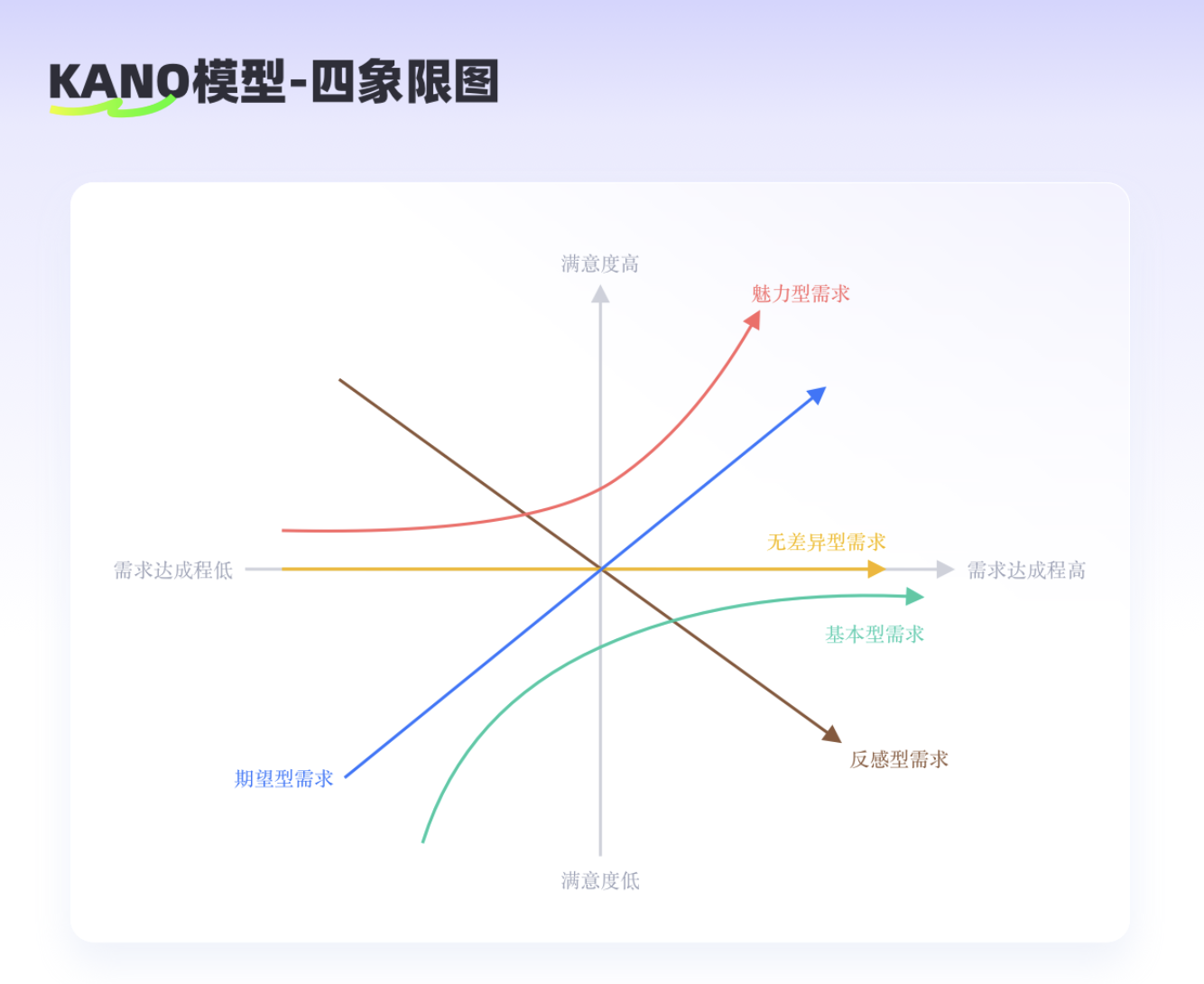 想做好愉悅感設(shè)計(jì),首先要明白:不是所有功能都能帶來(lái)愉悅,只有找對(duì) “用戶真正在意的需求”,才能避免 “費(fèi)力不討好”。東京理工大學(xué)狩野紀(jì)昭教授提出的 Kano 模型,能幫我們理清需求的優(yōu)先級(jí),找到愉悅感的發(fā)力點(diǎn)。