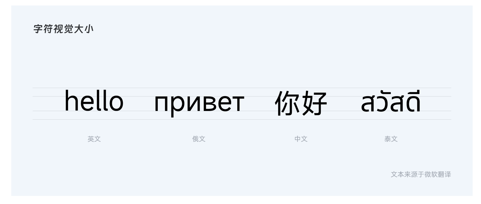 同一字號下,漢字的視覺感受明顯大于拉丁字母,而泰文則更小。比如 16 號字的 “你好”,視覺寬度相當于 16 號字 “Hello” 的 1.5 倍,這會直接導致按鈕、標簽的 “視覺擁擠度” 差異 —— 中文按鈕 100px 寬足夠,英文可能需要 120px,俄文則需要 150px。