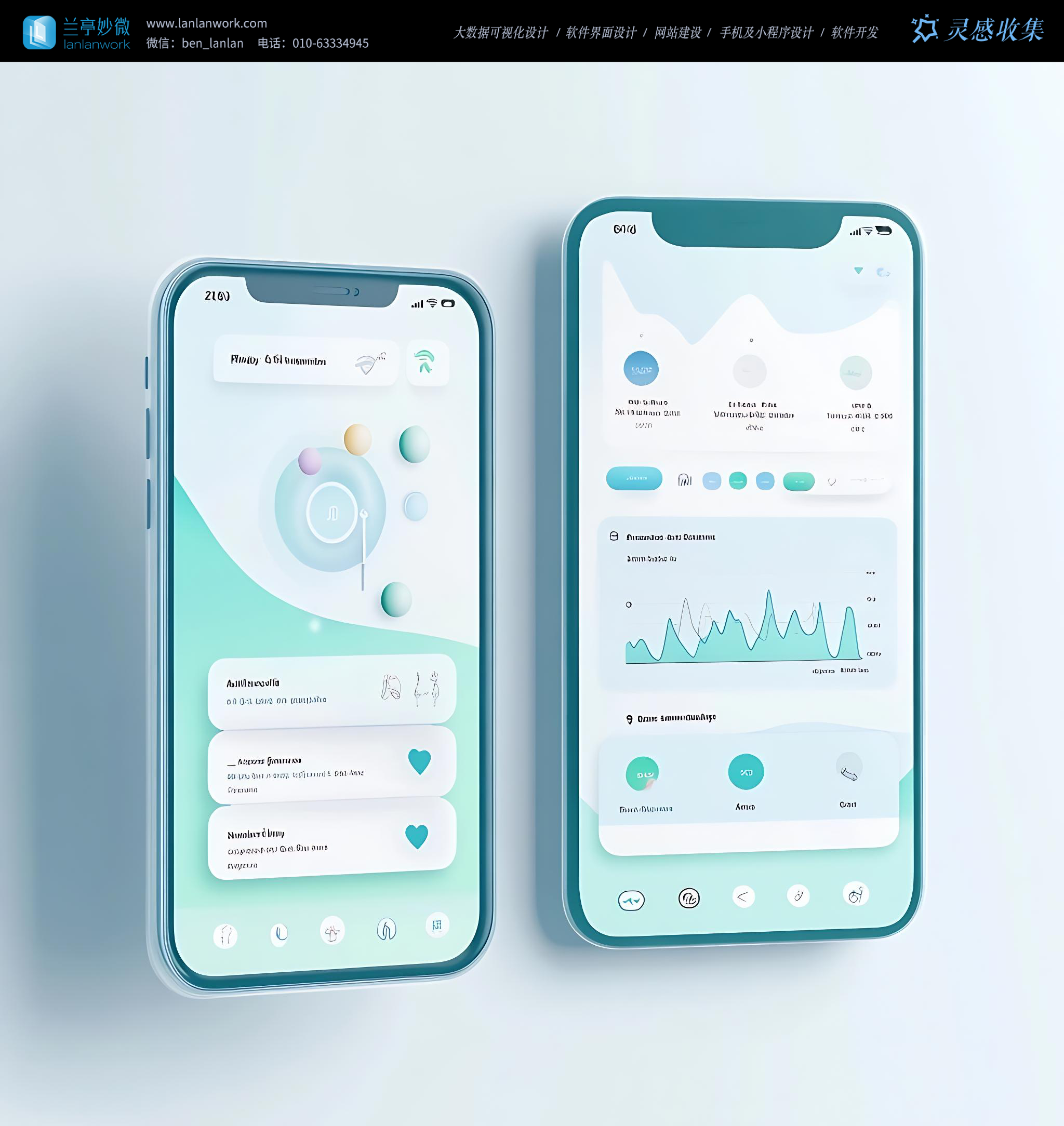 • 色彩與質(zhì)感:以淺藍(lán)、薄荷綠、暖白等低飽和度色系為主,搭配柔和漸變與透明玻璃質(zhì)感,營造出純凈、舒適的視覺體驗(yàn)。例如界面元素常采用毛玻璃效果,讓色彩過渡自然且富有層次感,像淡藍(lán)與淺橙的漸變波形、薄荷綠的數(shù)據(jù)圖表,既傳遞出科技感,又充滿治愈感。