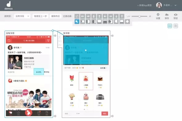 最后,聽說很多試用過的朋友都在詢問,如何在Demoo中模擬浮層的效果,Demoo其實更擅長的是頁面之間的跳轉,那么如何模擬呢?這里給大家一個小技巧。