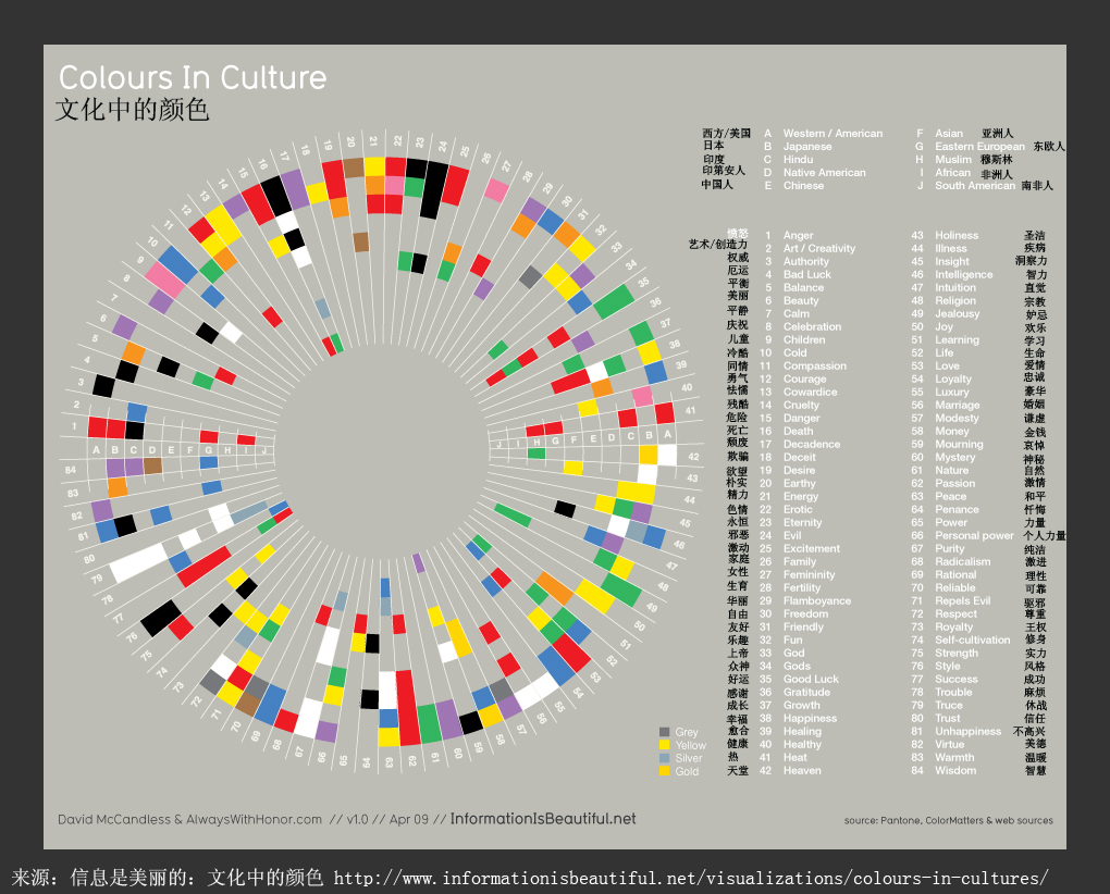 下面的圖表里包含了十種不同的文化,和62種情緒。同心圓代表不同的文化,而小方片代表了不同的情緒。因此,如果你想了解熱日本人對顏色的感覺,你就要看看這幅圖。如果你想知道在不同文化中什么顏色表示“危險”的話,你就要縱向的看這幅圖。