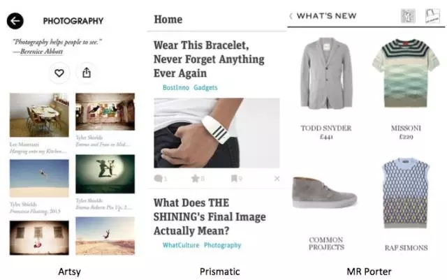 Artsy的圖片瀑布流,完全沒有用到線和面來區分信息組塊,而就是用內容本身做排版,用戶可以更加集中注意力于圖片內容上。Prismatic利用字體排版,盡可能的內容前置,弱化圖標和操作,讓用戶更集中注意力于內容閱讀上。而MR Porter則利用商品圖片、名稱和價格直接做設計,讓用戶聚焦于商品本身。