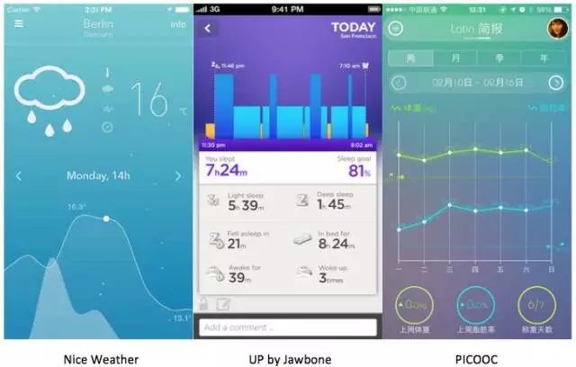 Nice Weather用曲線圖來表達溫度的變化,Jawbone UP用柱狀圖來表達每天的完成情況,PICOOC用折線圖來表達每天體重、體脂的變化。移動APP利用數據可視化,可以在更小的屏幕空間內,更立體化的展示內容。