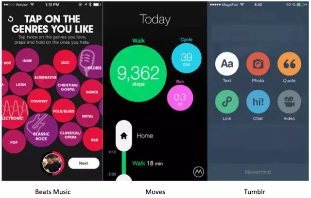 Beats Music把選擇喜歡的標簽設計成了圓形,這就比普通的列表、矩形tag的感覺要好很多,更加趣味更具探索性。Movse每天走的步數、消耗的卡路里均用圓形承載,是數據可視化、關鍵信息顯性化的最好案例。Tumblr則把要創建的內容的類型選擇,用蒙層+圓形選項按鈕來設計,讓選擇變得專注而明確,又不那么死板。