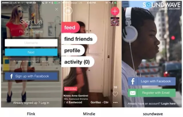 大視野背景圖風格也分為兩種,一種像Secret、The Whole Pantry這樣的,內容區塊中采用大視野背景圖,好處是可以利用圖片做區塊分割,難度是圖片拼接后的效果不一定好看,所以可能還需要配合描邊、留白等設計手段優化拼接。另外一種就是想Vsco、Flink、Mindie、Soundwave這樣的,全屏背景圖甚至打通狀態欄,前景做內容排版、導航、操作。好處是設計非常具有生命了,所有有朋友把這種風格也叫有計劃設計,說的就是回歸大自然的設計手法。但風險也是很明顯的,就是前景的信息排布設計其實是有很大挑戰的,必經花花綠綠的背景太過于干擾注意力,導致前景的文字內容可讀性會變弱。所以需要把重要操作用明確的按鈕區隔出來,閱讀型文字跟背景圖要用明顯的反色,還是不行的話就把文字浮在半透明蒙層上,解決可讀性問題。