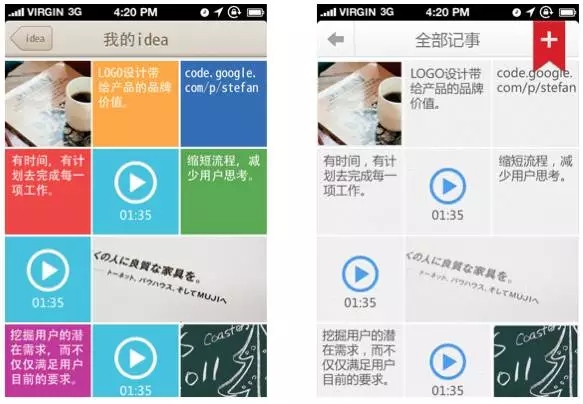 可是對于一些內容型的APP,也許并不適用,比如GoogleKeep的多彩卡片,確實是在內容閱讀上會起到反效果。百度云記事本第一版設計也是多彩色的,但是后來考慮到文字記事比較多,為提供良好的文字閱讀體驗,還是把多彩色改成灰白色微質感的設計。