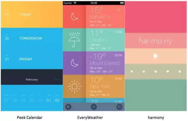 而Peek Calendar、EveryWeather和Harmony這三個APP,是列表多彩色的設計案例,這種列表多彩色,不知道是不是從Clear開始再度流行起立的,用鮮亮的多彩色來區分信息,確實能起到突出的效果,視覺上極其醒目。
