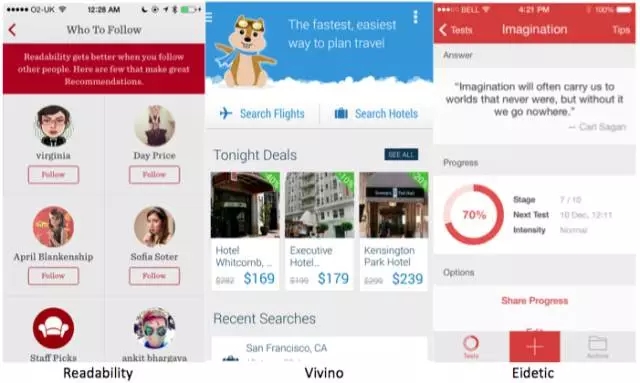 Readability采用紅色主色調設計,連提示信息背景色、線性按鈕和圖標都采用紅色主色調,界面和LOGO也完全是一個色系的。而Vivino采用藍色主色調設計,信息用深藍、淺藍加以區隔。Eidetic采用橙色主色調設計,其中的關鍵操作按鈕甚至整個用橙色提亮,信息圖標也用深橙色、淺橙色來表達程度。 可以說唯一主色調設計手法,是真的做到了移動端APP的最小化(Minimal)設計,減少冗余信息的干擾,使用戶專注于主要信息的獲取。
