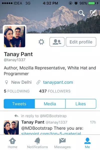 案例學習:Twitter上的切換鍵被放在屏幕的端。這幫助用戶更加快速的觸碰相關鍵如主頁(Home)、通知(Notifications)、消息(Messages)、我(Me)以進入軟件的各個部分。他們曾經(jīng)將按鍵放在了最頂端,然而這增加了大屏用戶使用難度。