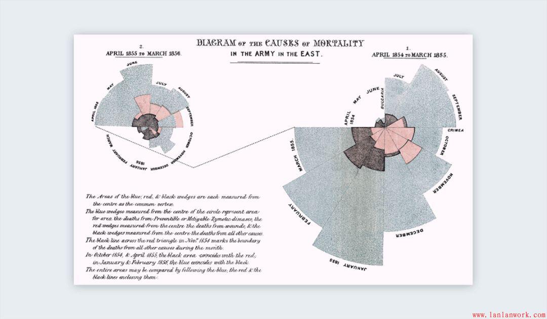 1857年,英國護士佛羅倫斯·南丁格爾使用信息圖形,說服維多利亞女王改善軍隊醫(yī)院的條件。她的圖表顯示了克里米亞戰(zhàn)爭每個月的死亡人數(shù)和原因:可預(yù)防的藍色疾病,紅色傷口和其他黑色病因。
