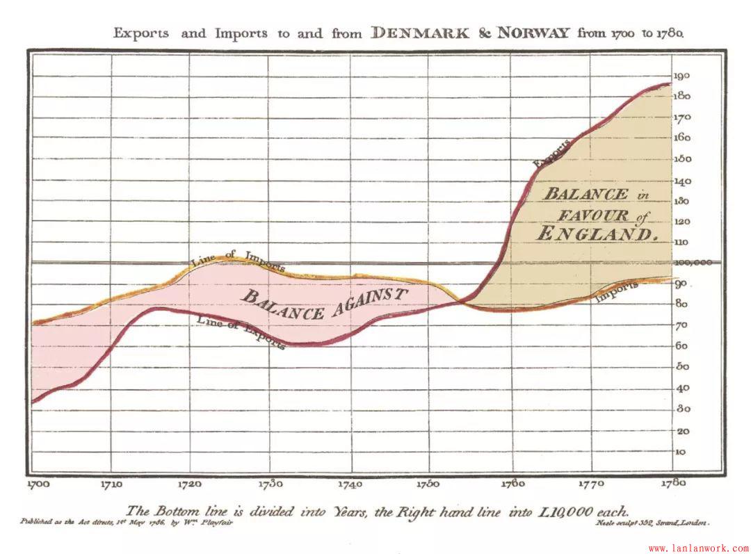 更為現(xiàn)代的信息圖表歷史可能始于William Playfair,他是統(tǒng)計圖形學(xué)的早期創(chuàng)新者。1786年,他出版了商業(yè)和政治地圖集,其中顯示了許多代表英格蘭經(jīng)濟的條形圖,折線圖和直方圖。他在1801年用第一張面積圖和第一張餅圖進行了跟蹤。
