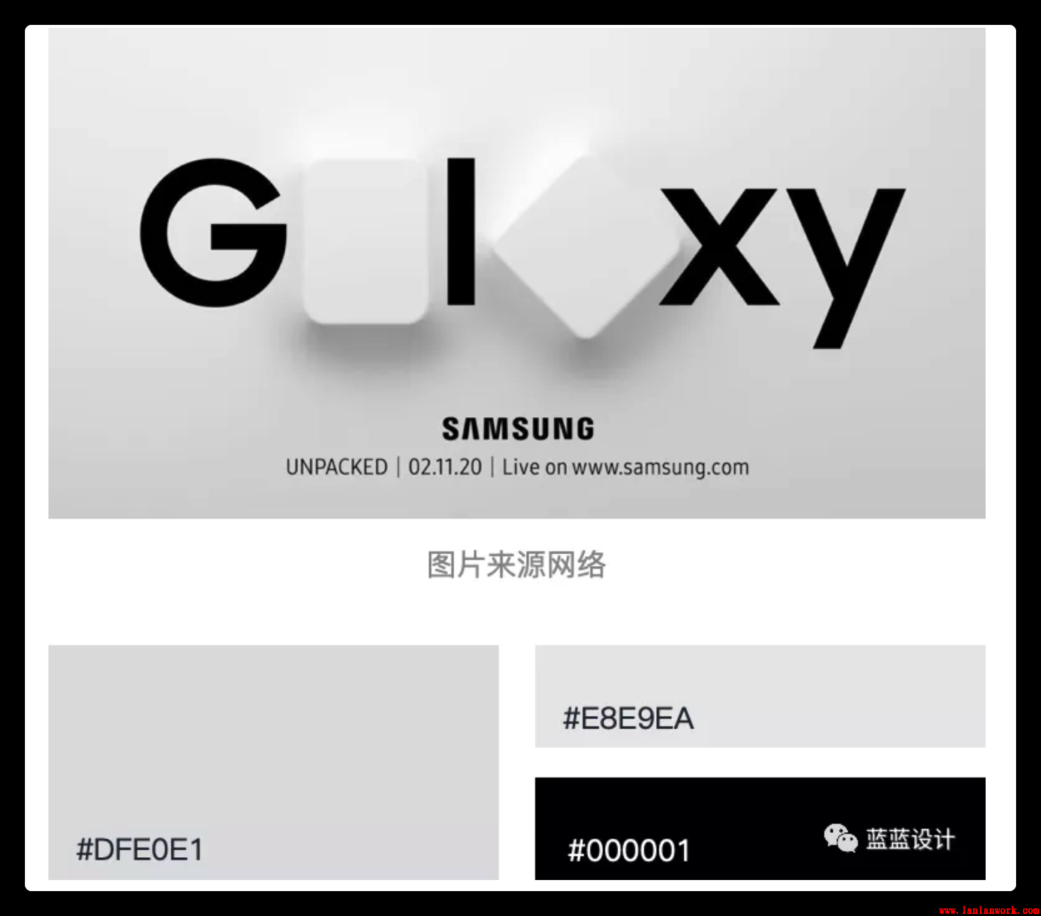 在2020年2月11號舉行的三星視覺發(fā)布會使用新擬態(tài)的設計手法作為設計海報。帶有漸變的淺灰色背景,結合富有層次感的光影漸變,充滿未來感。相對克制的色彩選擇和多角度的光影變化,強調出產品豐富的質感和科技感,簡潔而神秘。