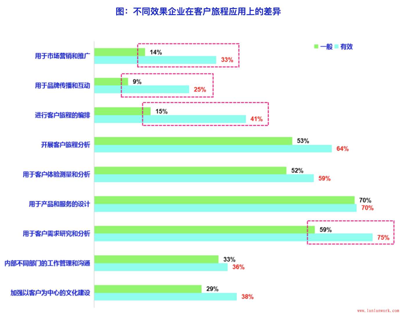 客戶旅程在不同領域的應用對最終的效果有明顯的影響:表示客戶旅程應用效果一般的企業在各個具體應用領域的應用比例均低于獲得明顯效果的企業。效果一般的企業在客戶需求研究和分析、客戶旅程編排、市場營銷和推廣,以及品牌傳播與互動方面的應用差距最大(落后超過10%的比例)。從調查數據來看,雖然用于編排、營銷和品牌的總體比例不高,但確實影響最終應用效果的顯著因素。