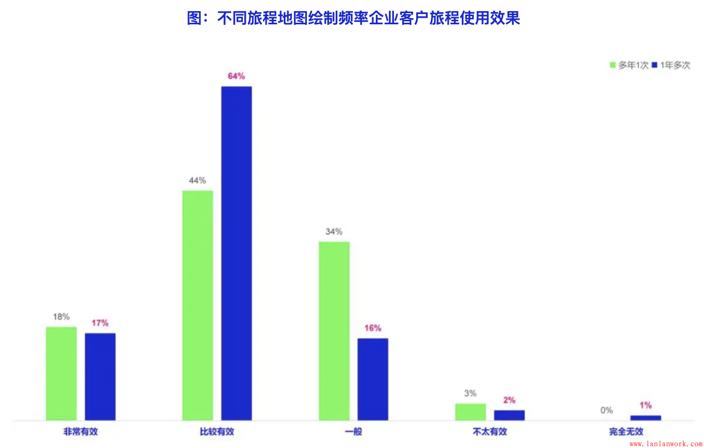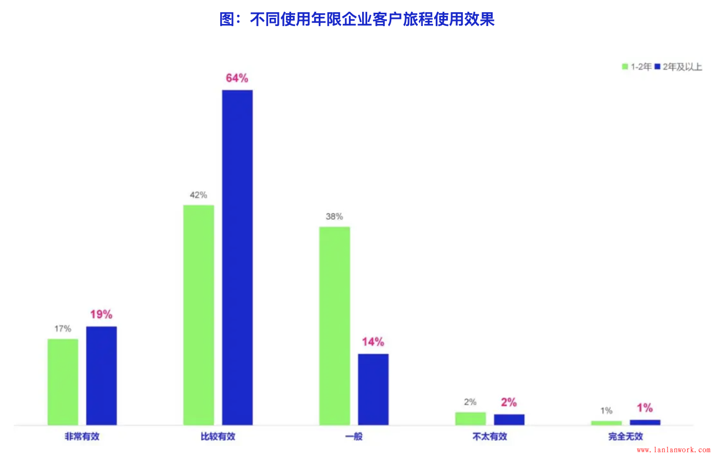 不同情況下,客戶旅程的應用效果也不盡相同。調查數據顯示,使用客戶旅程方法時間越長,繪制客戶旅程地圖頻率越高,客戶旅程方法取得的效果越好。使用2年以上的企業和2年以下的企業表示有效的比例(包括“比較有效”和“非常有效”,下同)分別為83%和69%;每年繪制多次客戶旅程地圖的企業和多年繪制一次地圖的企業的表示有效的比例分別為81%和62%。