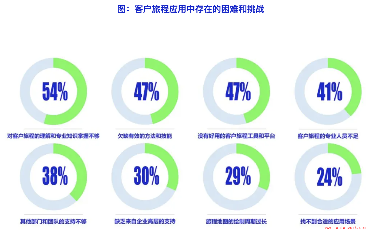 通過以上在不同領域的應用,客戶旅程方法在各個方面的效果都有所體現,尤其是在提升客戶滿意度、強化以客戶為中心的企業文化、提升營銷和運營的轉化率方面最為明顯,分別由59%、54%和37%的企業表示在這三個方面得到了提升。